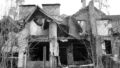 Ruined house with broken roof and windows overgrown trees